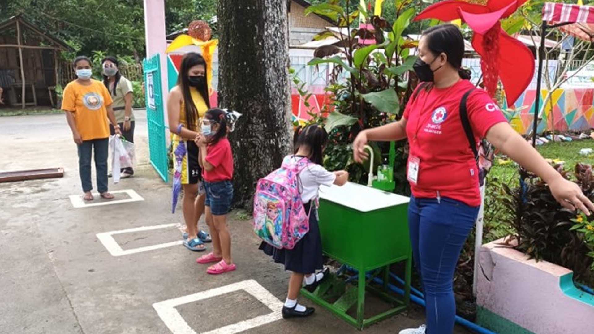In Laserna Integrated School in Nabas, Aklan, the learners have to pass through a foot bath, wash their hands and check temperatures using a non-contact thermometer before entering their classrooms.