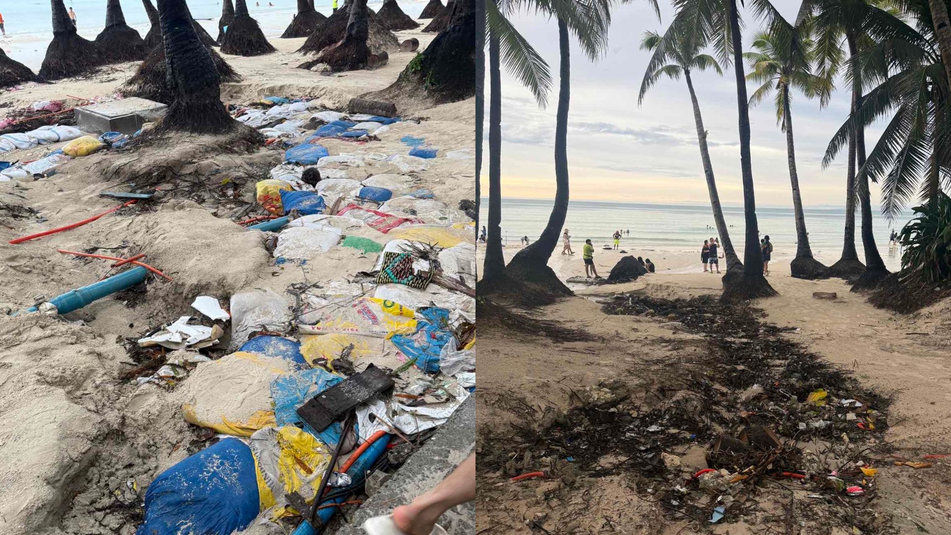 Locals say the drainage and road projects that were meant to protect the island are poorly maintained. Rainfall easily washes out sections of sand, leaving exposed sacks and pipes along the shore. Garbage from nearby establishments collects under the coconut trees. “The government says this is world-class, but we live with this mess every day,” said a resort worker in Station 2.