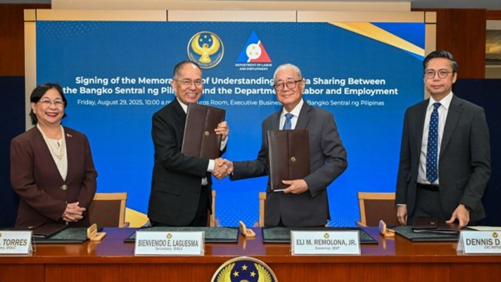 The Bangko Sentral ng Pilipinas (BSP) and the Department of Labor and Employment (DOLE) recently signed a memorandum of understanding (MOU) to enhance data sharing.