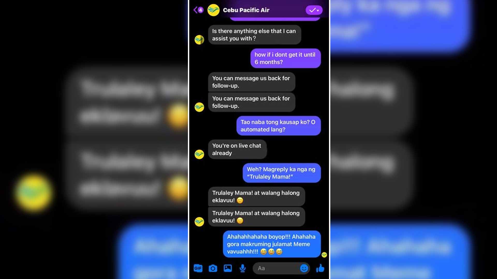 Cebu Pacific chatbot replied “Trulaley Mama! At walang halong eklavuu!” to one of its customers after messaging Cebu Pacific Air’s Facebook messenger to ask for a passenger’s refund.