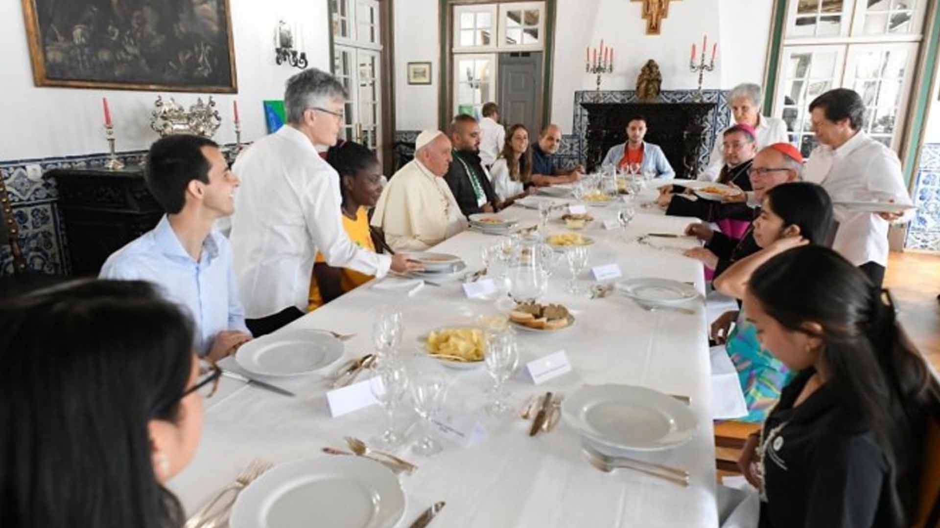 The Catholic Bishops’ Conference of the Philippines news website reported ages of those invited to have lunch with the Pope ranged from 24 to 34, and they hailed from different countries: three from Portugal, and one each from Peru, the Philippines, Equatorial Guinea, United States, Palestine, Colombia and Brazil.