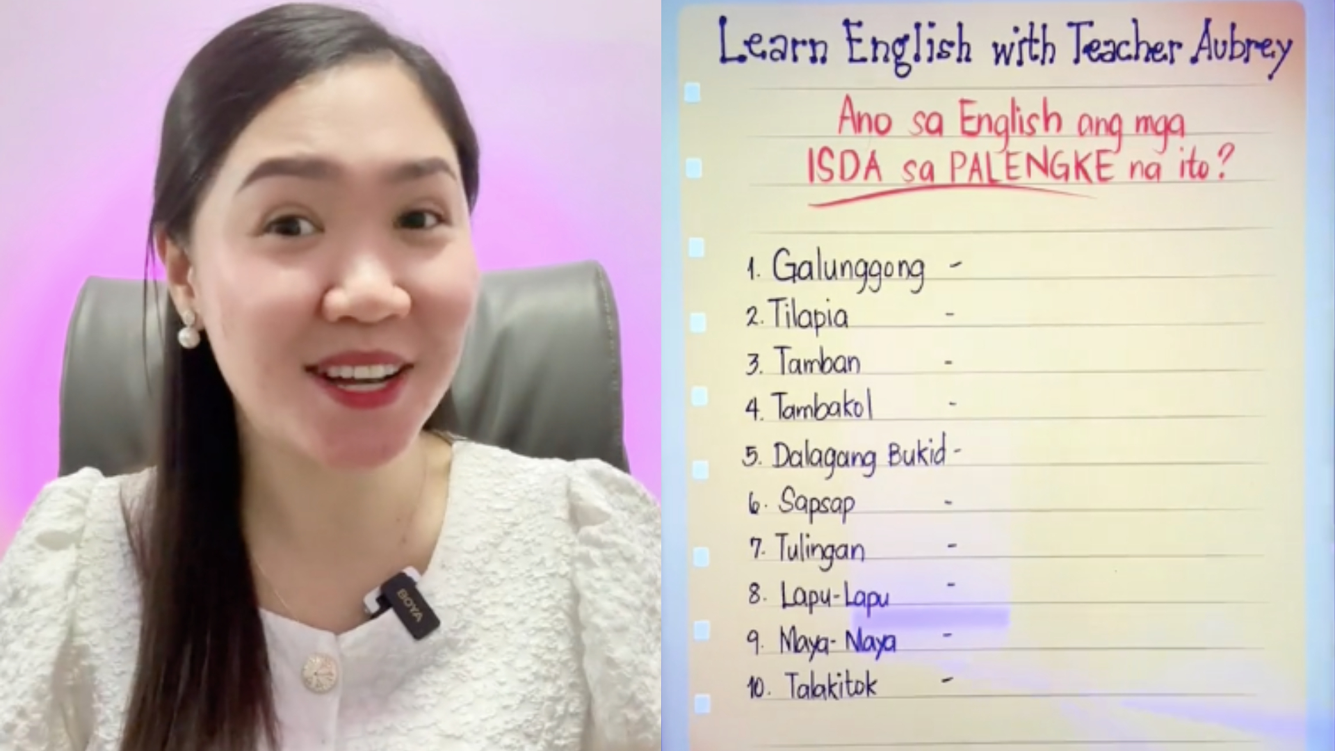 Known for her content segment on TikTok titled ‘Learning English with Teacher Aubrey,’ Filipino teacher and writer Aubrey Bermudez-Badaguas became trending for translating common market fish into English words.