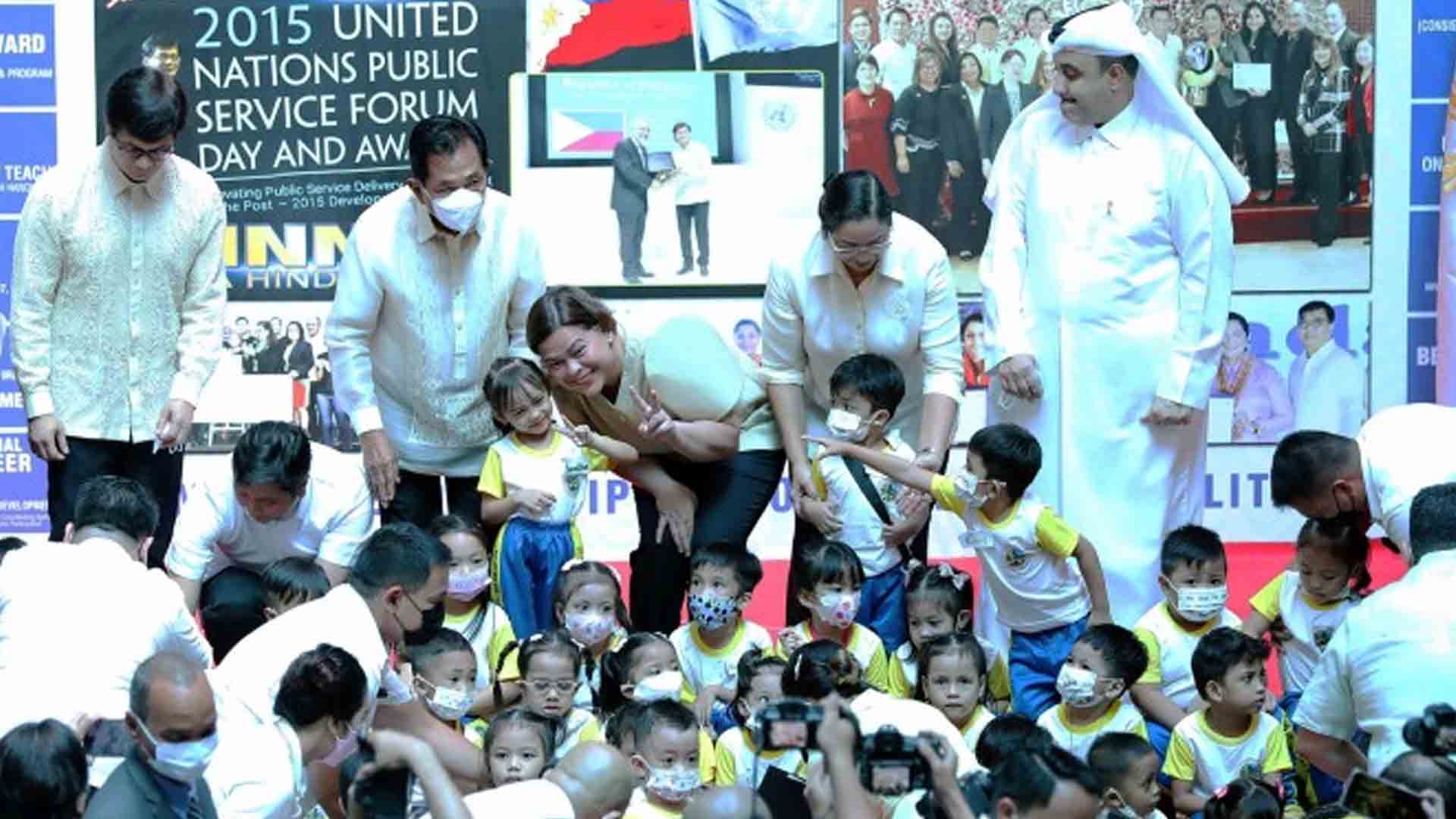 Vice President and Education Secretary Sara Duterte and officials of the Embassy of Qatar on Thursday handed out school materials to daycare learners at a gift-giving event in Mandaluyong City.