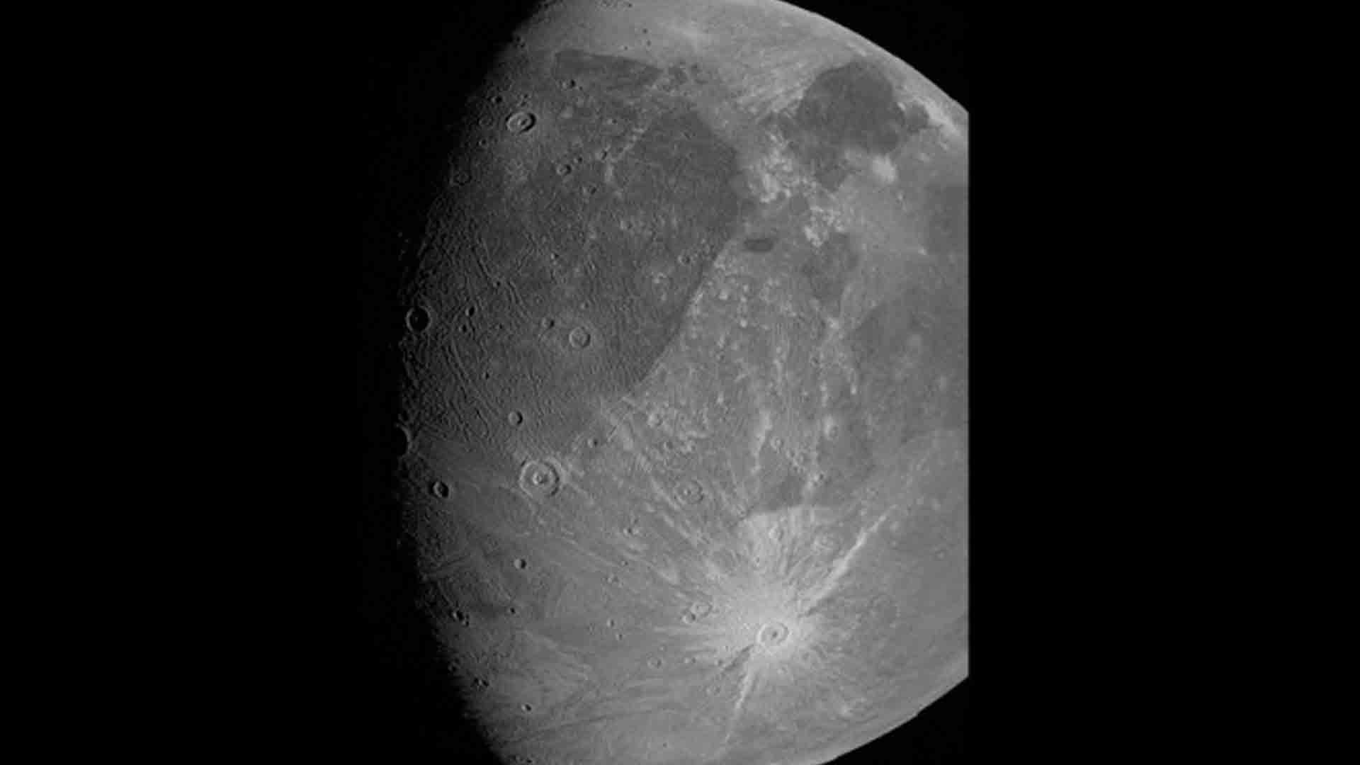 Like Earth’s moon, the photographs show Ganymede with dark patches on its lighter, overall dull color.