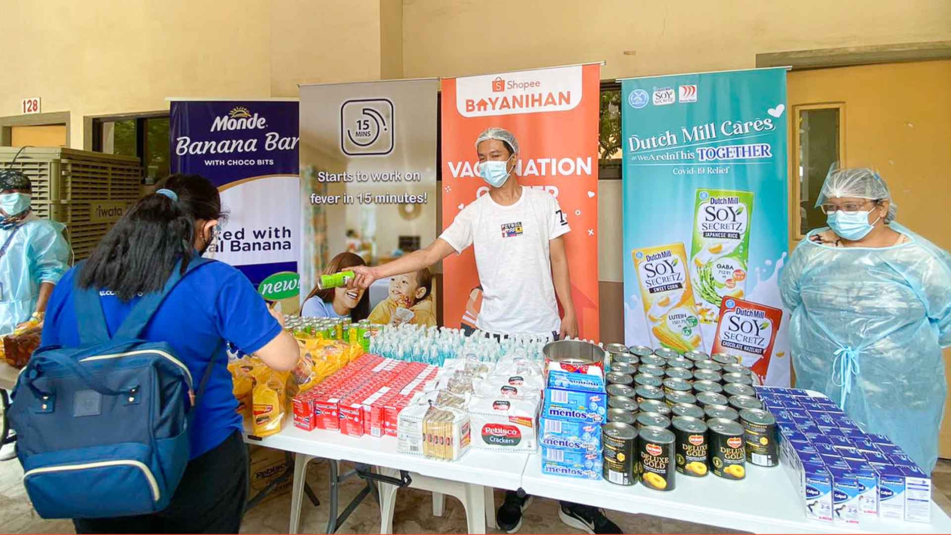 The package given to Maktizens and frontliners included snacks from Del Monte, Perfetti Van Melle, Dutchmill Soy, Monde Nissin, and Rebisco; bottled water from Hope in a Bottle; and health kits from Mighty Clean.