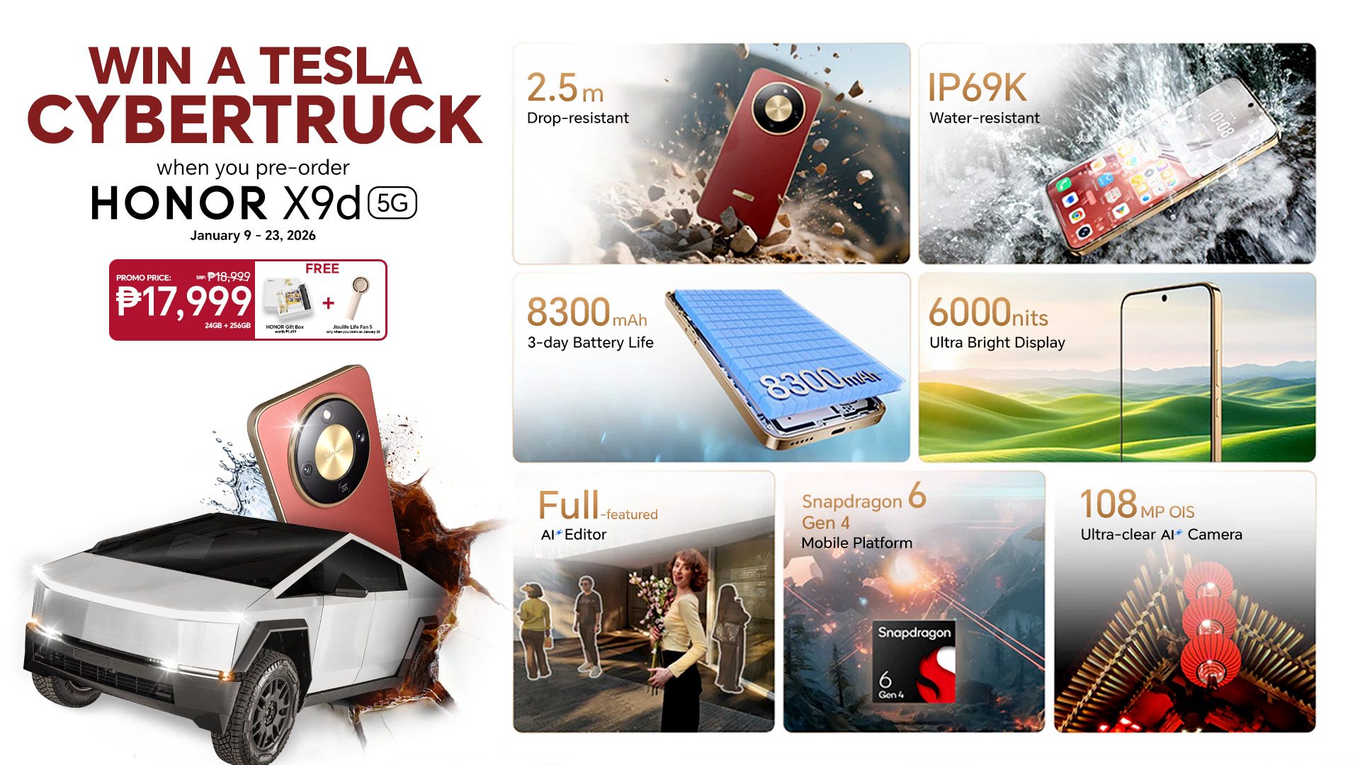 With an introductory price of Php 17,999, the HONOR X9d 5G pre-order starts from January 9 to 23, where you can get a chance to win a Tesla Cybertruck. What are you waiting for? Run to any HONOR Experience and Partner Store or online via Lazada (https://bit.ly/Laz_X9d_PR), Shopee (https://bit.ly/Shop_X9d_Media) or TikTok Shop (https://bit.ly/TikTok_X9d_Media).